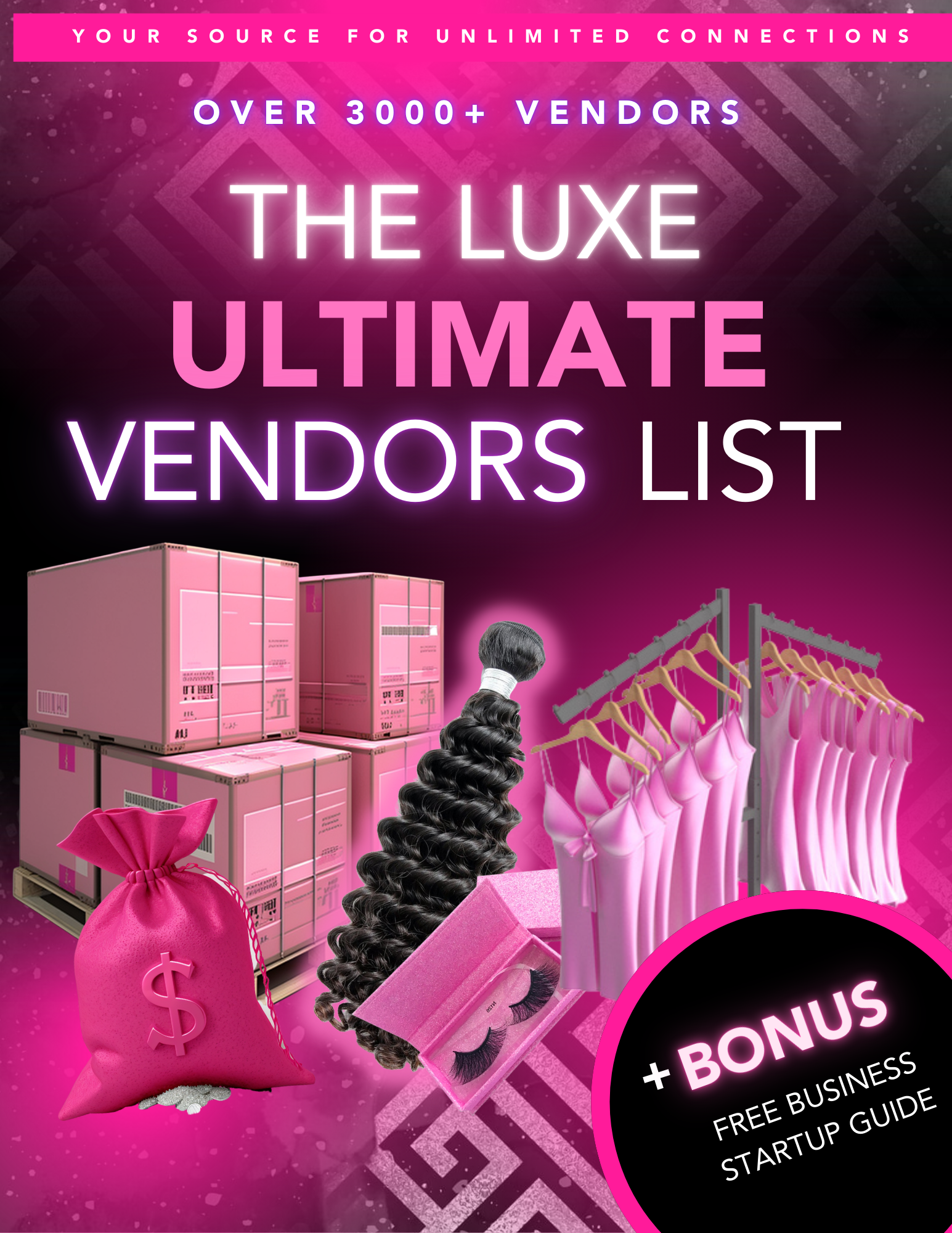 The Luxe Vendors List is a 49-page digital ebook packed with over 3,000+ verified vendors supplying everything from lashes, clothing, and high-quality wigs to hair bundles and luxury goods.